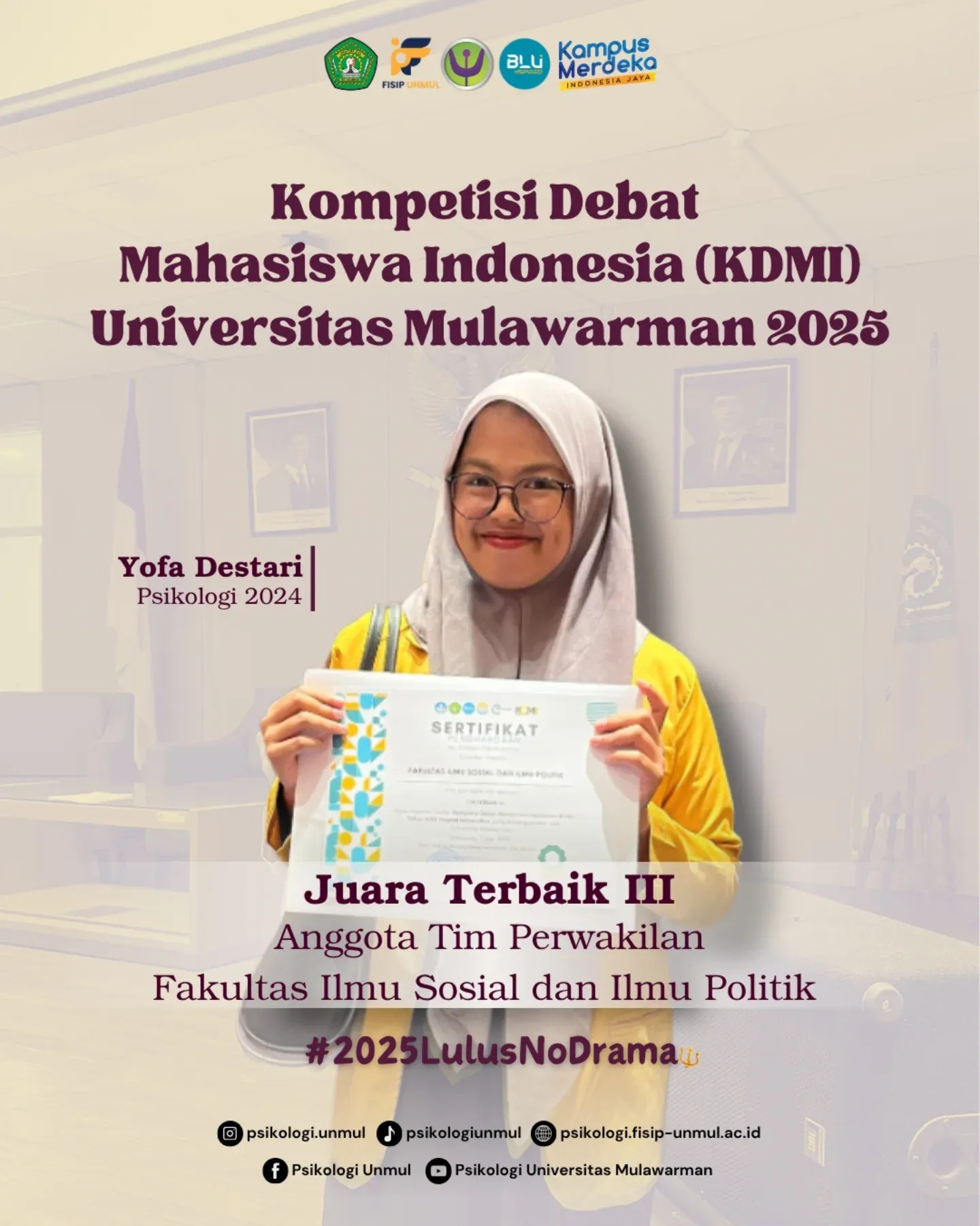 Selamat kepada Yofa Destari, mahasiswi Psikologi angkatan 2024 sebagai salah satu anggota tim perwakilan dari Fisip Unmul yang meraih ๐๐๐ฎ๐ฟ๐ฎ ๐ง๐ฒ๐ฟ๐ฏ๐ฎ๐ถ๐ธ ๐๐๐ dalam Kompetisi Debat Mahasiswa Indonesia (KDMI) Tingkat Universitas Mulawarman Tahun 2025๐คฉ๐ฅณ