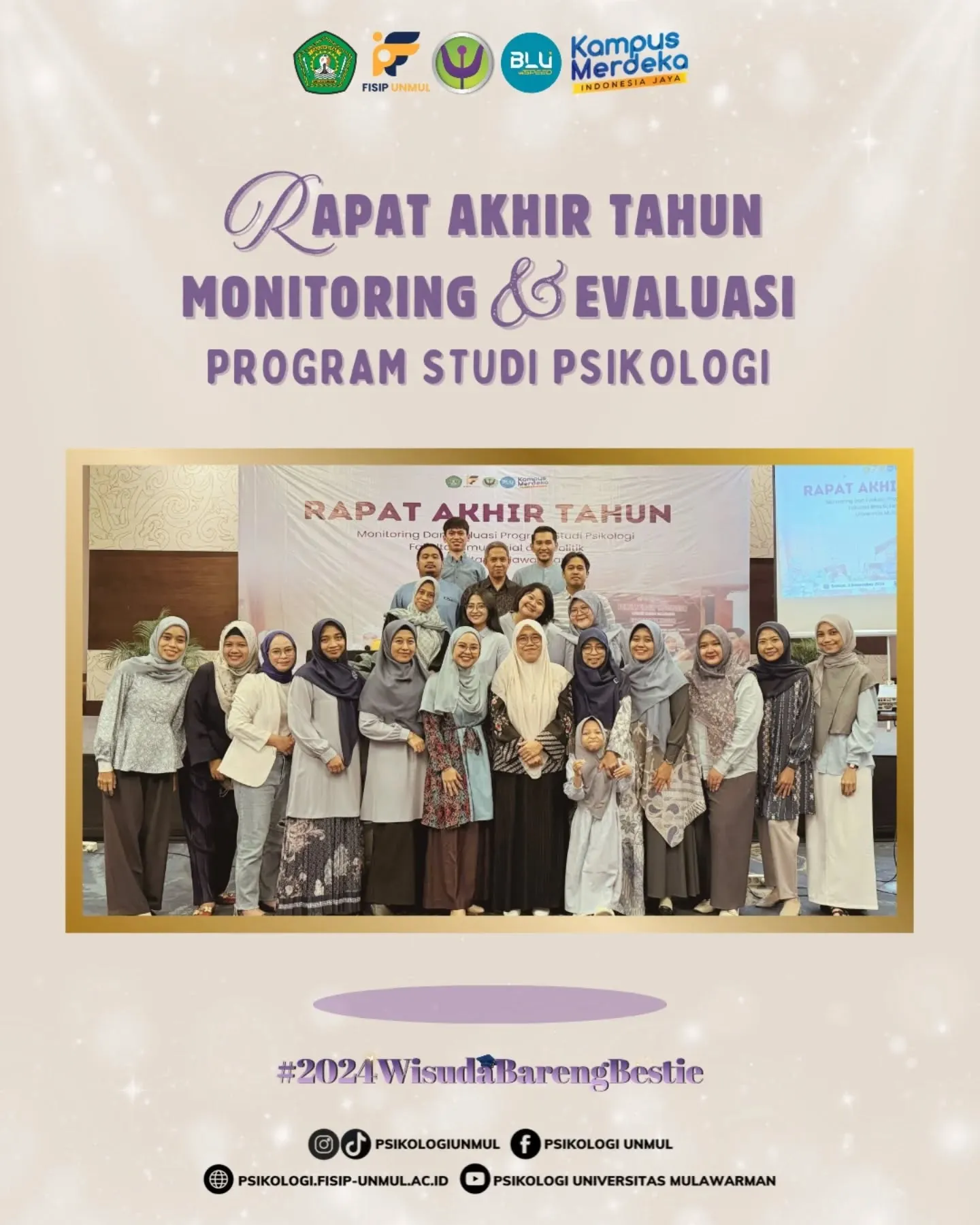 Jumat, 6 Desember 2024 kemarin, Psikologi Unmul telah melaksanakan rapat monitoring dan evaluasi di Hotel Midtown, Samarinda, yang dihadiri oleh Dekan FISIP UNMUL, Ibu Dr. Finnah Fourqoniah, M.Si, dan juga seluruh dosen serta tendik Psikologi Unmul.